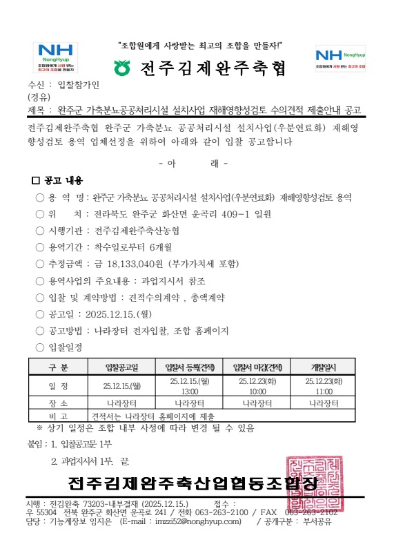 완주군 가축분뇨공공처리시설 설치사업 재해영향성검토 수의견적 제출안내 공고